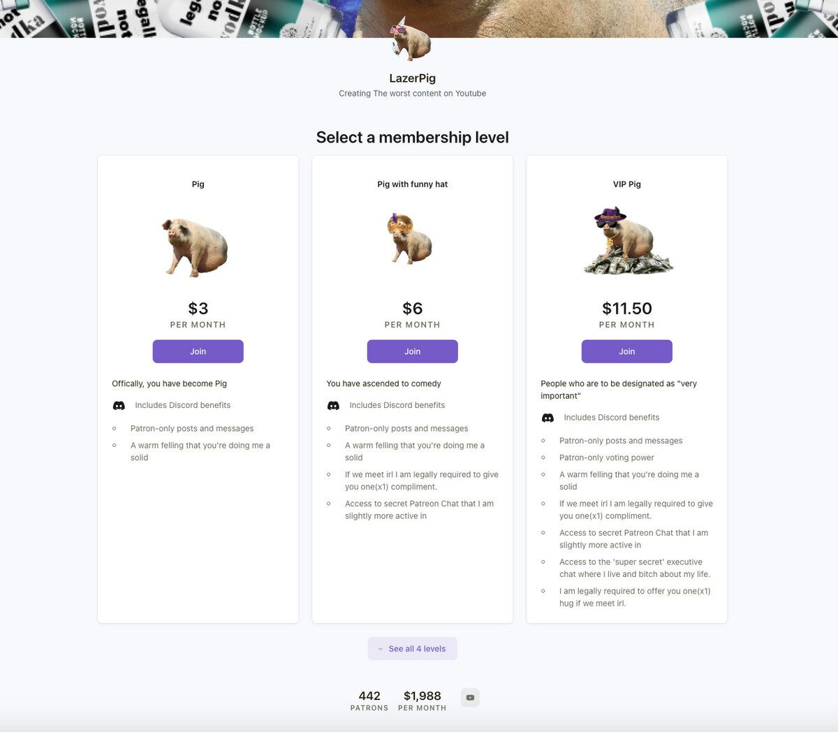The next great thing that LazerPig did was launch a discord. Discord allowed LazerPig’s community to engage with each other. They can chat in different channels, engage in contests and vote on topics LazerPig should cover in the next video. The discord still exists but after launching it and maintaining it for almost 6 months, LazerPig decided to launch an actual revenue-generating channel, Patreon.