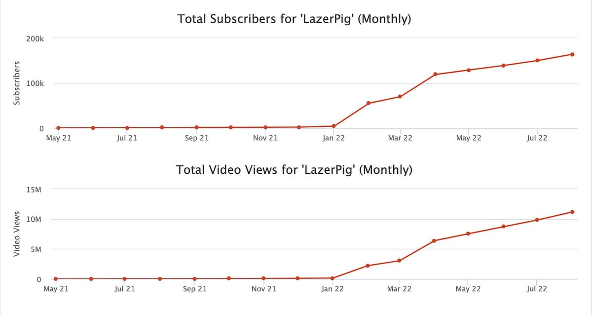 Let’s take a look at LazerPig’s subscribers and views that are identical and correspond to how Pig didn’t see a big takeoff until about 14 months of consistent uploads. His first video was in November 2020. His cadence is weekly but it can also be more frequent when he wants.