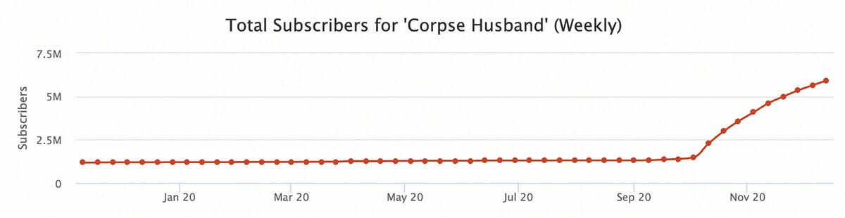 Right around late October is when Corpse saw a great trajectory of growth and that is when he was recruited to play Among Us with big streamers on the platform and Congresswoman AOC as well. That hockey stick growth can be attributed to that and over that week, he gained 1M+ subscribers which was astronomical growth compared to the prior 6 months.